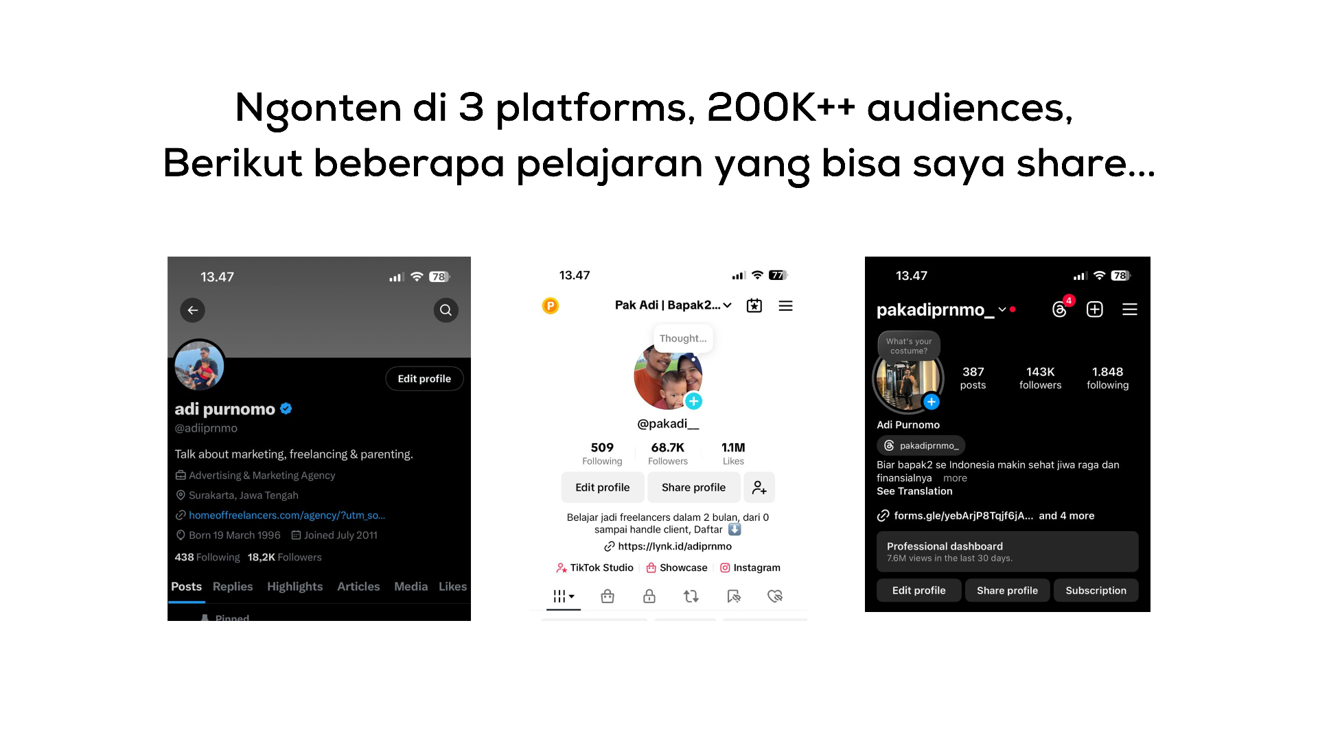 Ngonten di 3 platforms IG, TikTok & X, dengan total 200K++ audiences, Saya share panduan dasar hingga teknis dalam mengembangkan akun sosial media. Baik untuk personal maupun untuk brand.